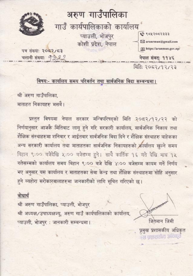 कार्यालय समय परिवर्तन तथा सार्वजनिक विदा सम्बन्धमा।